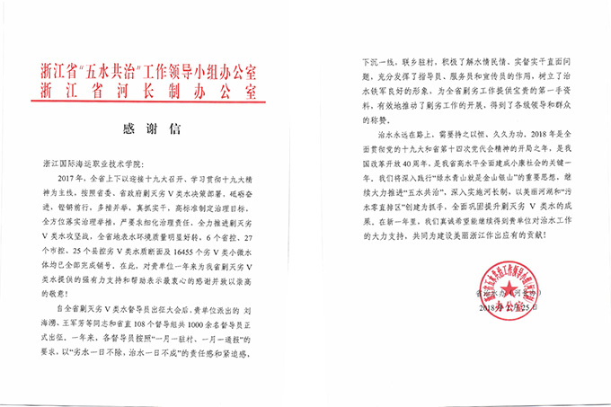 近日,浙江省“五水共治”工作领导小组办公室(河长制)办公室向我校发来感谢信,对我校一年来为浙江省剿灭劣V类水提供的强有力支持和帮助表示衷心的感谢,特别对我校派出的刘海湧、王军芳2位督导员的工作表示了充分肯定。