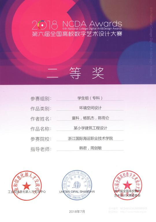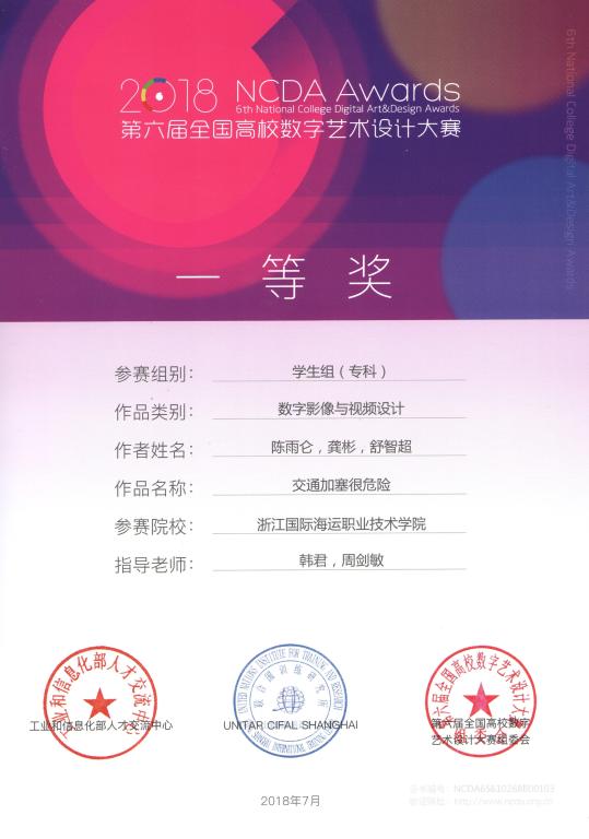 在第六届全国高校数字艺术设计大赛中,由韩君和周剑敏等老师指导,陈雨仑、龚彬和舒智超等学生创作的《交通加塞很危险》和童科、杨凯杰和陈雨仑等学生创作的《某小学建筑工程设计》两件非命题类作品分别获得第六届全国高校数字艺术设计大赛一等奖和二等奖。