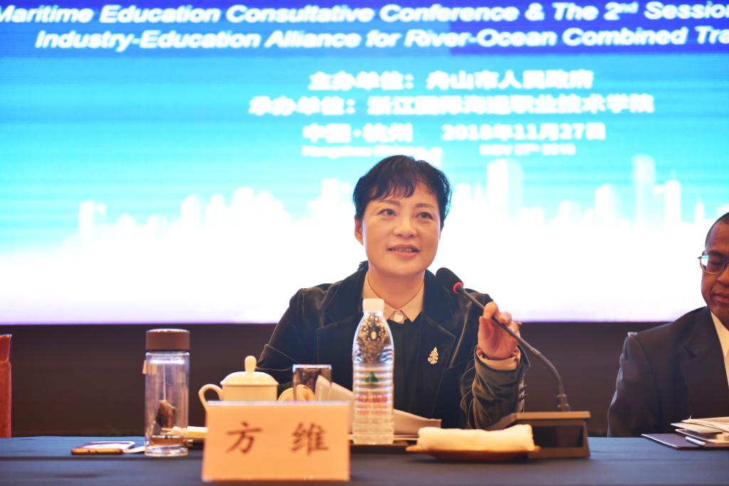 舟山市人民政府副市长方维作上午会议的总结讲话。她向来宾生动介绍了“四个舟山”和舟山自贸试验区建设、舟山航空产业园和甬舟铁路等舟山经济社会发展情况,希望航海职业教育找准定位、明确目标、精准发力,不断深化改革创新。一是进一步深化产教融合、校企合作,高度重视行业组织和企业的作用,充分发挥“江海联运”产教联盟成员单位的特色和优势,推动跨区域、跨产业合作;二是进一步转变理念,学校要主动创新“工学结合”的人才培养模式,吸引企业深度参与,将工匠精神融入职业教育;三是进一步优化专业设置,根据舟山市产业发展和行业组织需求,有针对性地谋划设置相关专业,并随着经济转型、新经济新产业发展不断优化,源源不断输送有用人才。