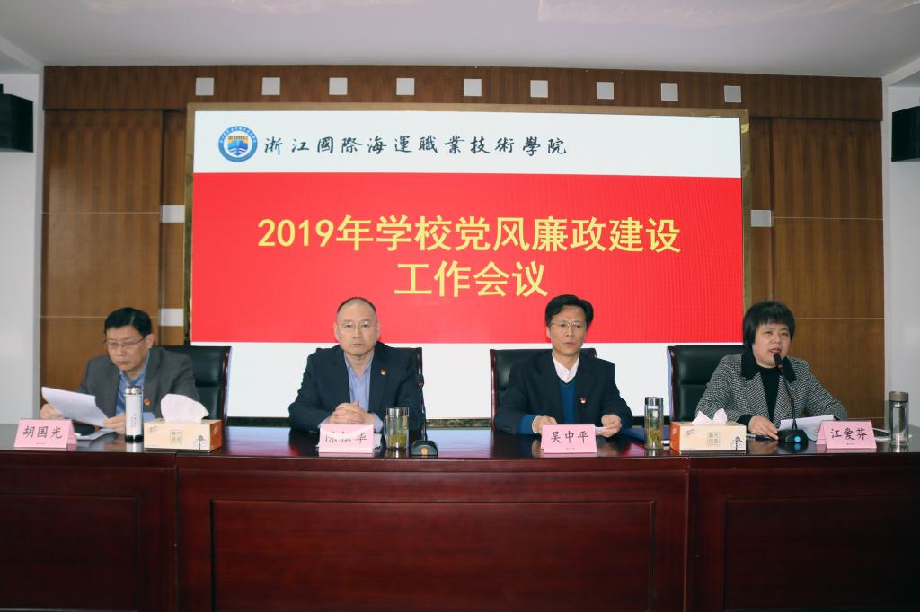 党委委员、纪委书记江爱芬首先代表学校党委、行政回顾总结了2018年我校党风廉政建设工作,部署2019年工作任务。2018年,学校认真落实中央和省委、市委、省纪委、市纪委决策部署,强化学习教育,落实管党治党主体责任,加强廉政风险防控,坚决纠正“四风”问题,全面执行党的纪律, 推进“清廉学校”建设,为学校健康发展提供了坚强的政治保障。2019年主要任务是:继续坚持以习近平新时代中国特色社会主义思想为指导,深入学习贯彻党的十九大精神和十九届中纪委三次全会精神,认真落实上级党委纪委决策部署,坚持党要管党,全面从严治党;以党的政治建设为统领,深入推进全面从严治党;以党的作风建设为重点,打造忠诚干净担当干部队伍;以廉政风险防控为主线,筑牢党风廉政建设根基;以“清廉海运”建设为载体,培育良好政治生态;以监督执纪为主业,加强纪委自身建设,为学校“两个高质量”建设提供坚强的政治保障。