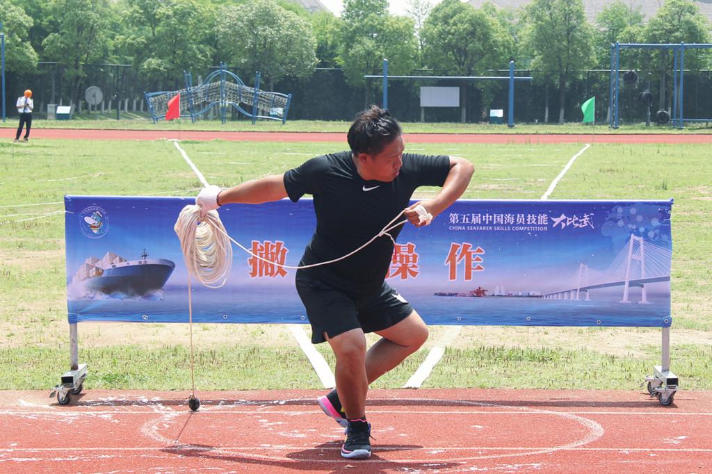 上午,25支院校队和5支港澳台队在浙江海洋大学田径场参加了撇缆项目的比赛。作为传统赛事,该赛项要求每队选派5名驾驶专业的选手,在规定的弧形方位内,进行定点抛投引缆绳。每个选手抛投3把,将最好1把的成绩计入团体总分。今天雨过天晴,天公作美,为撇缆的比武增添了观赏性。