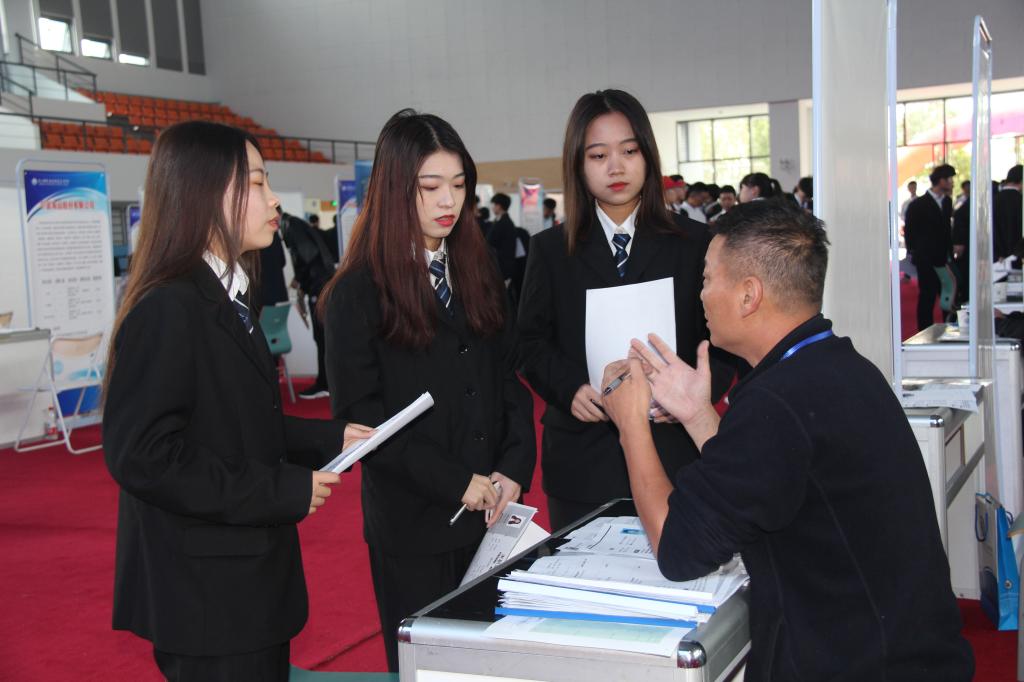 上午9时,学校体育馆内人流如织。来招聘的80多家企业一字排开,排成6列。每家摊位前都布置了展架,上面写着单位介绍、招聘岗位、招聘人数、薪资待遇等。各企业的工作人员认真向同学们介绍企业基本情况、岗位情况、薪资待遇和晋升制度等,同学们也就各方面情况向企业进行了咨询。