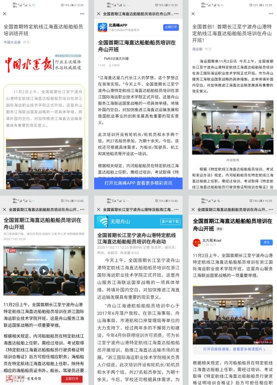 11月2日,全国首期长江至宁波舟山港特定航线江海直达船舶船员培训在我校启动,获得了国内多家主流媒体关注。浙江之声、舟山电视台、舟山广播、舟山日报、舟山晚报、航运圈等媒体记者来校现场采访报道。《中国交通报》、《中国水运报》、《浙江日报》、《浙江工人日报》、《潇湘晨报》、浙江之声、浙江交通之声、搜狐网、中国港口网、航运信息网等媒体均以大篇幅进行了刊载或转发报道,充分展示了我校紧密对接江海联运国家战略,加快推进江海直达运输发展和我国航运事业创新发展,迈出了关键性步伐,填补了国内空白,引起良好社会反响。