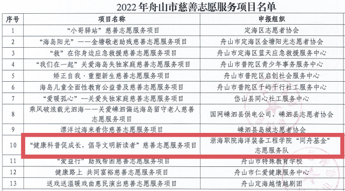 在2022年“舟山有你·越来越好”志愿服务集市创投活动中我校共申报志愿服务项目6个,3个获市级立项。其中,学校青年志愿者总队的“银龄跨越数字鸿沟”科普志愿服务项目和港口管理学院的女子交通队文明交通劝导志愿服务项目被舟山市精神文明建设委员会办公室、共青团舟山市委员会、舟山市志愿者协会立项;海洋装备工程学院“同舟基金”志愿服务队的“健康科普促成长,倡导文明新读者”慈善志愿服务项目被舟山市慈善总会、共青团舟山市委立项。