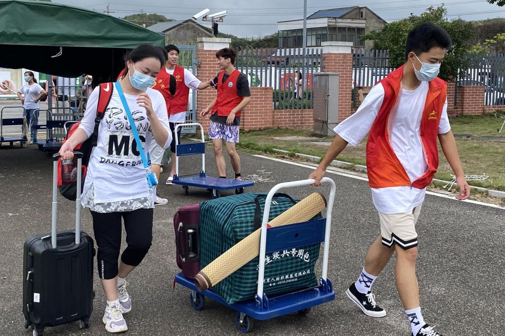 出于常态化疫情防控的要求,今年家长依然不能进入校园,家长们将新生们送到门口后,驻足目送新生们在志愿者们的帮助下步入校园。