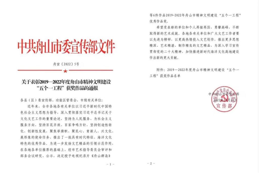 据悉,2019-2022年度舟山市精神文明建设“五个一工程”奖共表彰优秀作品6部。(宣传部)