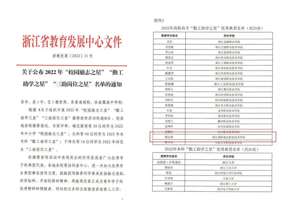 根据浙江省《关于组织开展2022年“校园励志之星”“勤工助学之星”“三助岗位之星”推荐宣传活动的通知》,经各二级学院推荐、申报,近期浙江省教育发展中心公布了获奖名单,我校学子殷达典荣获2022年高职高专“勤工助学之星”荣誉称号。