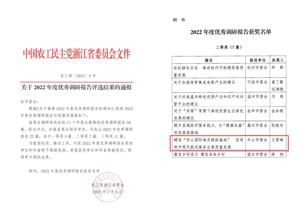 近日,航海工程学院教师王雪峰的调研报告《建设“舟山国际海员换班基地” 促进我市现代航运服务业健康发展 》获评农工党浙江省委会2022年度优秀调研报告二等奖。