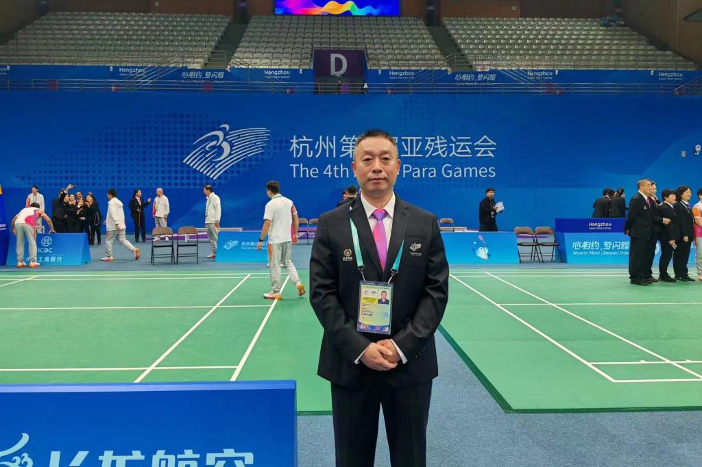 95日,应建伦收到了杭州第19届亚运会组委会下发的选派文件,有幸成为杭州第4届亚残运会羽毛球项目92名国内技术官员之一,开启了在杭州滨江体育馆连续十一天的执裁工作。在本届亚残运会上,他严格要求自己,服务好选手,做到公正裁决,全力维护比赛的公平正义。