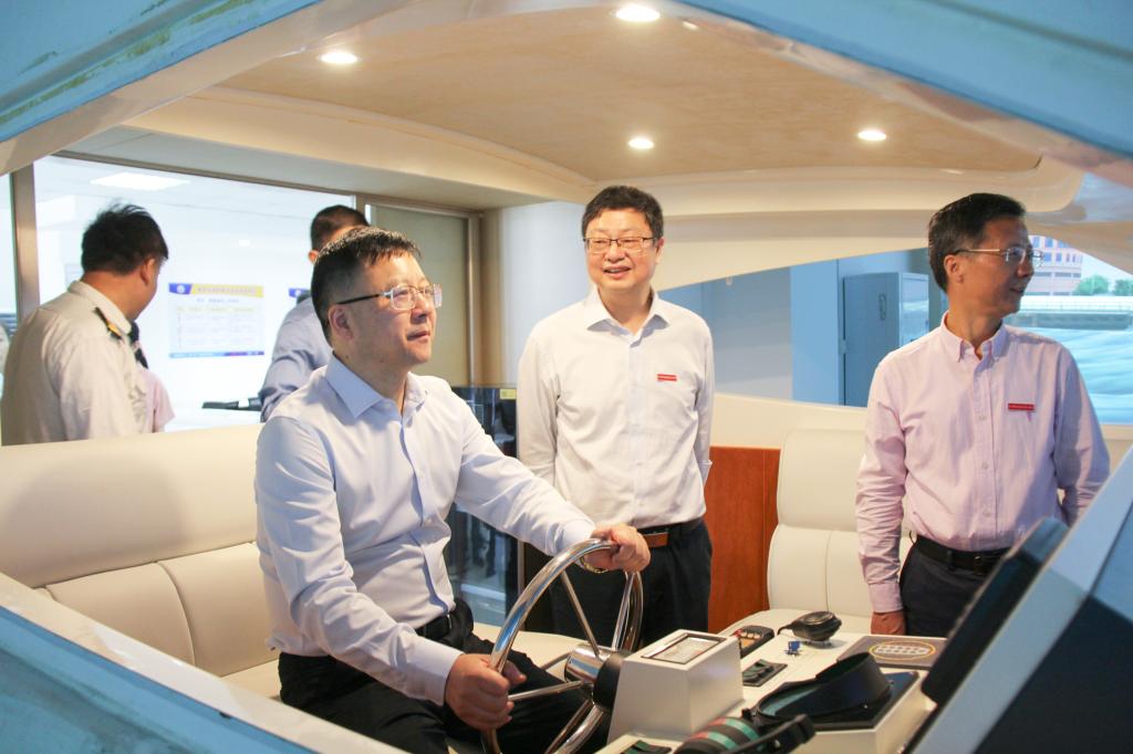 李武杰一行参观了学校航海操纵模拟器、游艇模拟器、轮机模拟器、国家级航海虚拟仿真中心、全国舰船科普教育基地船舶知识馆等,深入了解我校的办学条件、实习实训、人才培养和内涵建设等方面工作开展情况。
