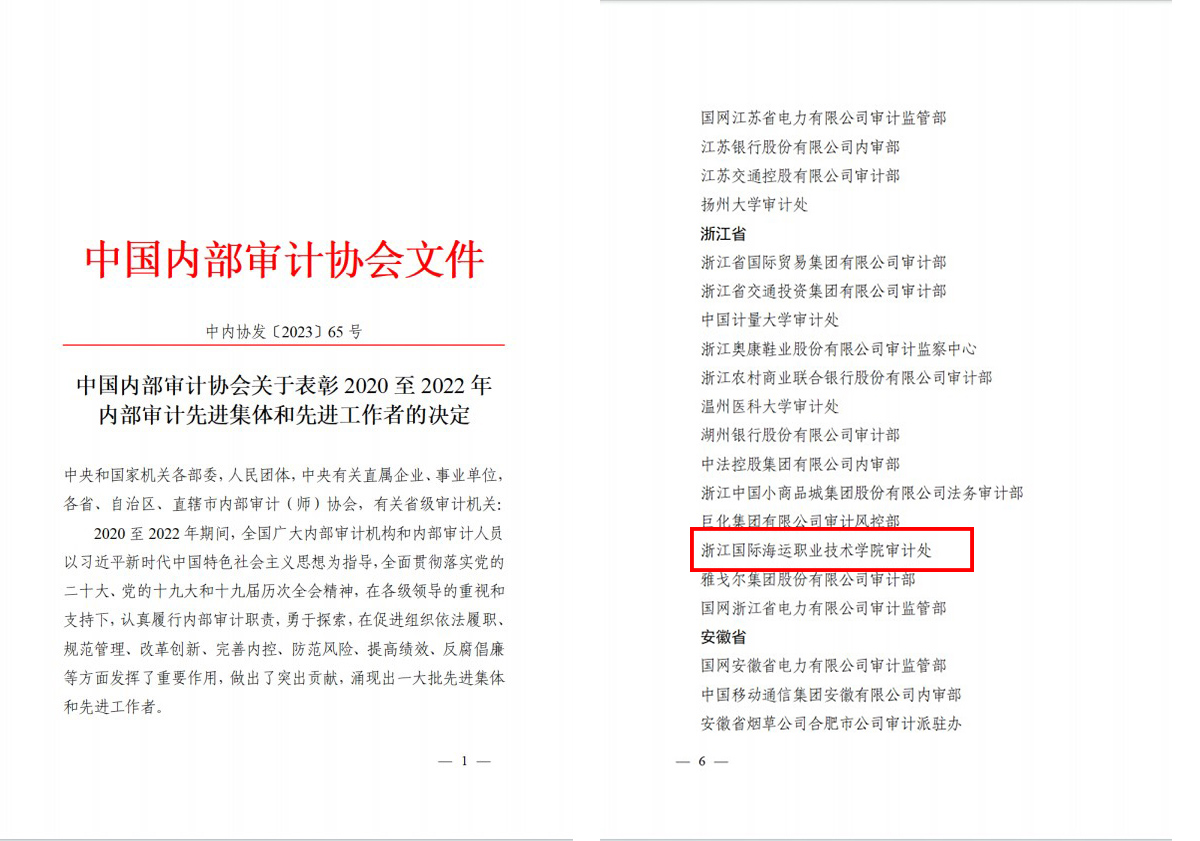 近年来,学校深入贯彻落实习近平总书记关于加强内部审计工作的重要指示精神,大力推动学校内部审计工作。在学校的正确领导下,审计处紧密围绕上级关于加强高等院校内部审计工作的要求,以风险防控为导向,以依法审计为抓手,以整改落实为举措,聚焦风险短板,注重举一反三,在规范项目管理、高效使用资金、遏制腐败发生等方面切实发挥监管和保障作用。审计工作也多次得到上级主管部门及行业协会认可,2021、2022连续两年荣获“舟山市内部审计先进集体”称号。