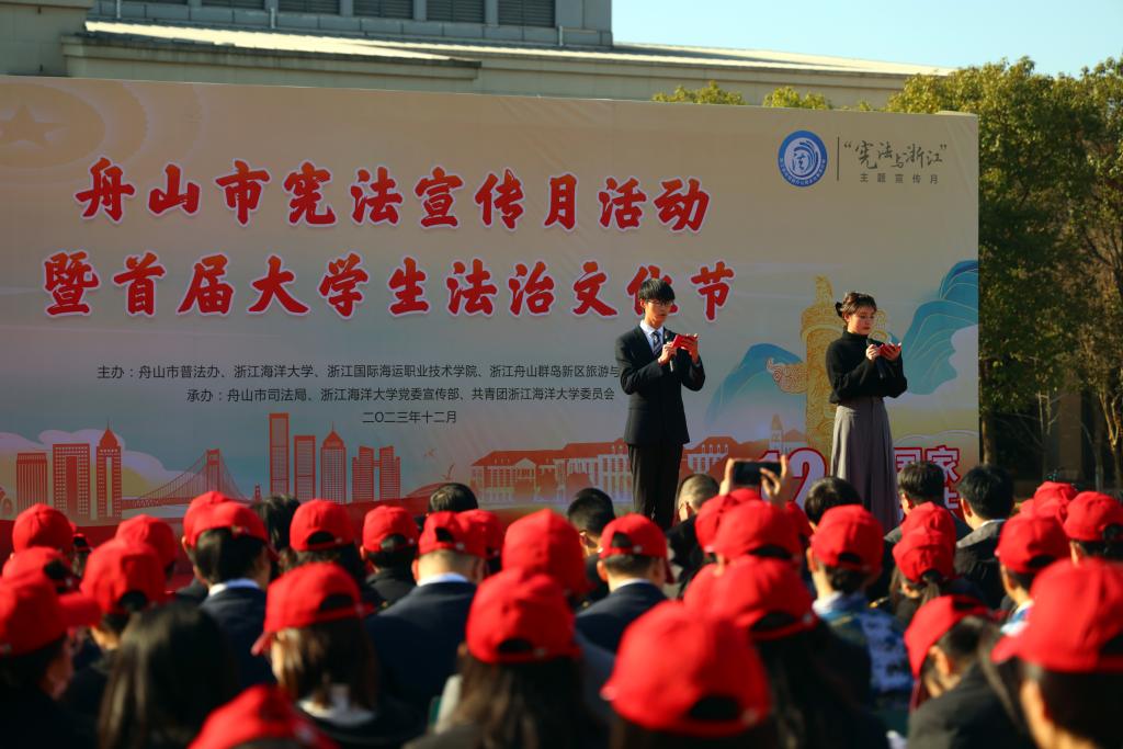 “本宪法以法律的形式确认了中国各族人民奋斗的成果,规定了国家的根本制度和根本任务,是国家的根本法,具有最高的法律效力……”12月2日,在由我校共同主办的舟山市首届大学法治文化节活动中,200余名师生齐声共读《中华人民共和国宪法》。“宪法晨读”让青年学子在庄严的仪式中更加坚定法治信仰。