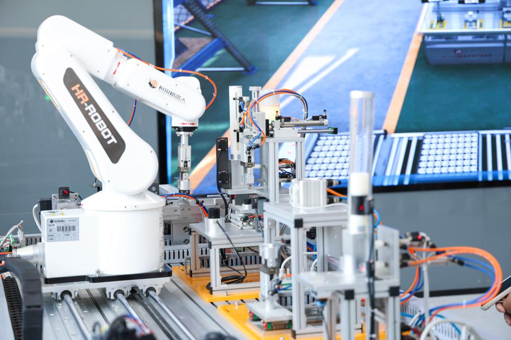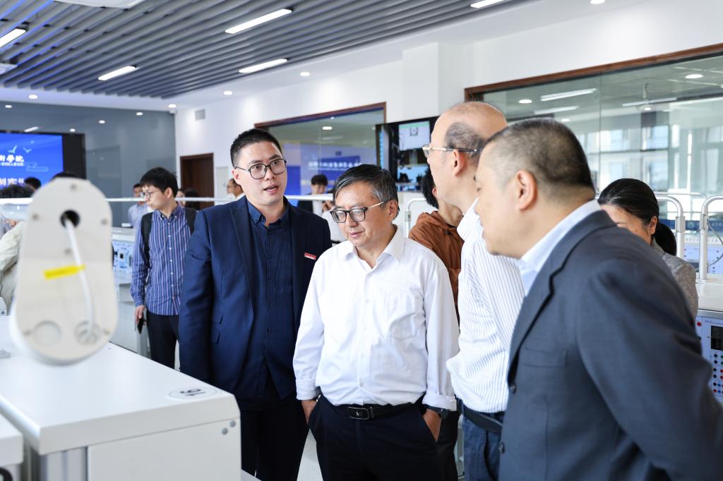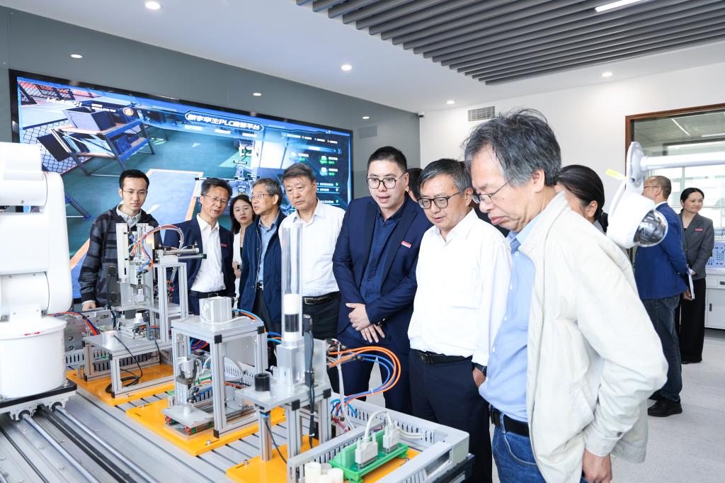 随后,各位领导和嘉宾实地参观了PLC控制实训室,体验数字孪生虚拟智慧工厂和智能制造生产线,纷纷为实训中心先进的教学设备、新颖的教学方案、沉浸式的工业现场学习环境以及相关细节设计等点赞。