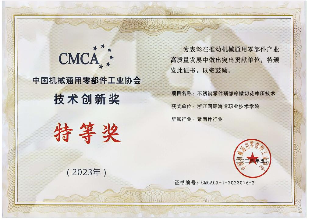 近日,中国机械通用零部件工业协会八届一次会员代表大会在四川成都召开, 会议表彰了获得2023年度“中国机械通用零部件工业协会技术创新奖”的单位,由我校科研与合作处何琪教授主笔,与舟山7412工厂联合申报的《不锈钢零件颈部冷镦切花冲压技术》项目荣获2023年度“中国机械通用零部件工业协会技术创新奖”特等奖,是获奖单位中唯一的高职院校。