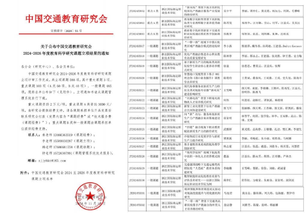 近日,中国交通教育研究会公布了2024-2026年度交通教育科学研究课题立项结果,我校19个项目在列。以吴中平校长领衔的《‘新双高’背景下地方高职院校深化产教融合服务产业发展的路径研究》等3项课题列为重点课题,其余16项列为一般课题。