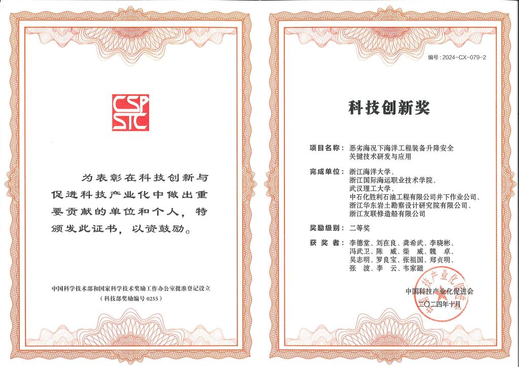 近日,第四届中国科技产业化促进会科学技术奖名单揭晓。我校海洋装备工程学院刘在良教授作为第二完成人的项目成果《恶劣海况下海洋工程装备升降安全关键技术研发与应用》荣获中国科技产业化促进会科技创新奖二等奖。
