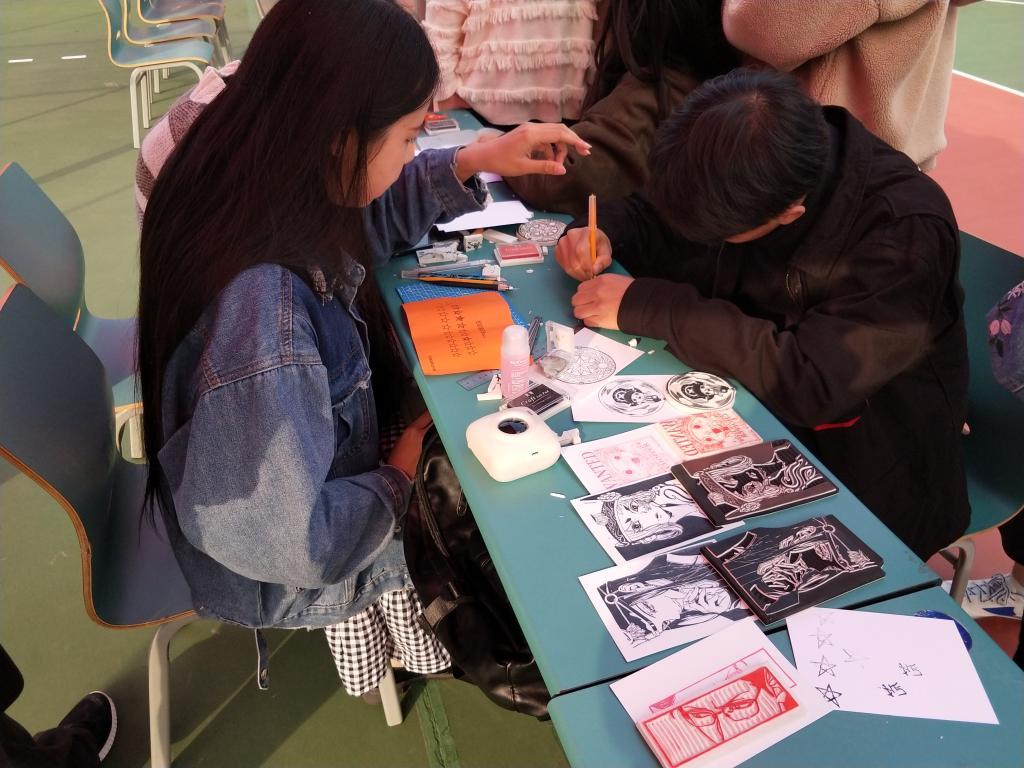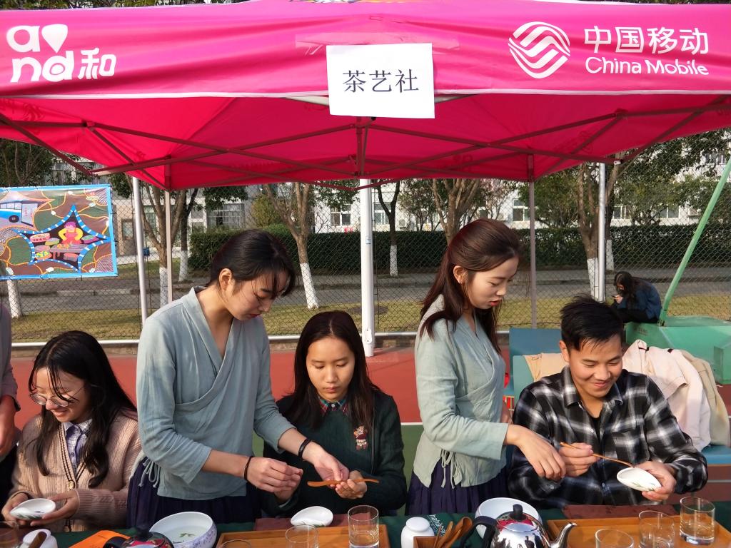 展示区的社团则各自准备了体现社团特色的互动游戏,弦心社的乐器教学、茶艺社的茶艺学习、手工社的捧花制作吸引了不少参与者,活动尚未开始时就有许多同学排队等候。