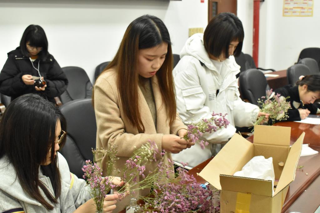 3月6日晚,海洋旅游学院团学干部自发组织开展了一次“春风十里不如有你”的插花活动。同学们提前购买了所需物品和花材,将花枝修剪,整枝,再根据不同的色彩有层次地搭配在一起,配上句句暖心祝福。7日上午,团学干部们迫不及待地将一束束花送到女教职工手上,打动老师的不仅是绽放的鲜花,还有学生发自内心的祝福。(图/尹民 文/邬加白)