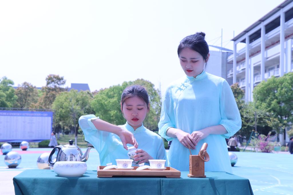 在董浩云广场进行的茶艺展示中,同学用木勺舀上茶叶放进盖碗,用旁边壶中烧开的水淋过,蒸汽携带着茶香袅袅上升。心在茶烟中渐渐沉淀,一种久违的熟悉感涤静了胸中的苍凉,脑海一片空宁。沸水反复相沏,而后倒进瓷碗中,以大拇指、食指、中指,呈“三龙护鼎”,力道轻缓柔匀地端起青瓷,不破茶魂。青瓷托于掌心,几片茶叶在清澈碧绿的液体中舒展,旋转,徐徐下沉,再升再沉,三起三落,芽影水光,相映交辉,泡制出一杯好的茶。茶艺展示是为了让参加开幕式的师生可以零距离的观赏、品鉴茶文化,给师生在骄阳下带来一抹清凉。
