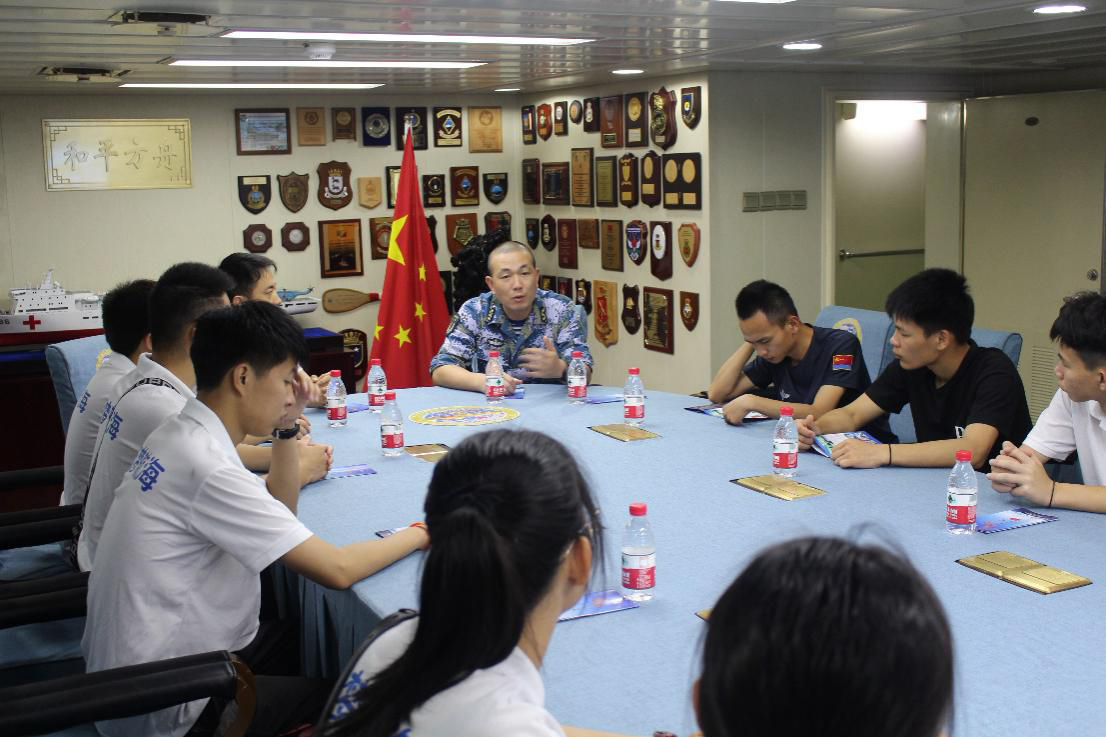 在船上军医的带领下,同学们参观了船上的基本医疗场所和官兵起居室。同学们仔细聆听讲解,认真观看医护设备。干净整洁的环境、完善的医疗设施、浓厚的学习氛围给同学们留下了深刻印象。
