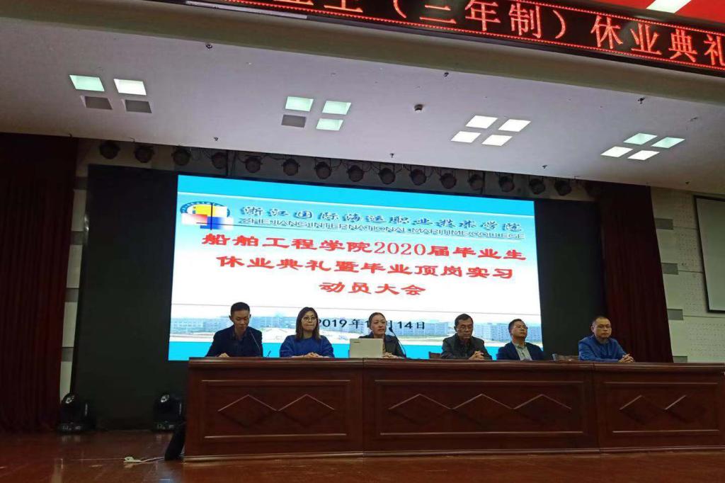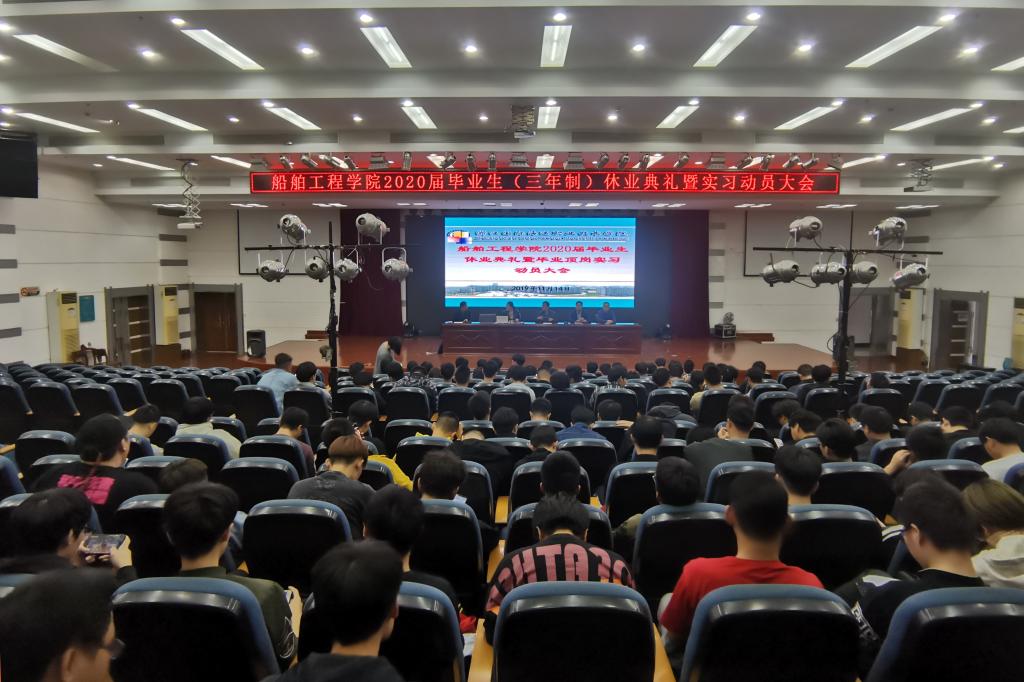 11月14日下午,船舶工程学院2020届毕业生(三年制)休业典礼暨毕业实习动员大会在图书馆四楼报告厅举行,学院行政班子、专业团队负责人、学业导师、辅导员和全体2017级毕业生190多人参加了会议。会议由学院办公室主任蒋仲仁主持。