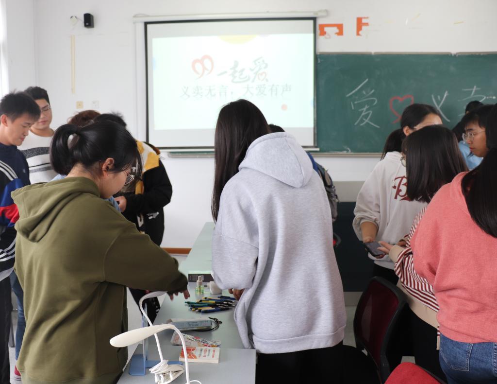 11月28日中午,团学干部们将从师生中收集的二手物品整理后,在1412教室开展了爱心义卖活动。活动一开始,场面火爆,四周都围满了咨询义卖物品价格的同学,随着活动的深入,同学们不仅购买到了自己需要的物品,更让点滴爱心汇聚成幸福的暖流,流淌于每个人的心间。(文/管建民 图/陈志伟)