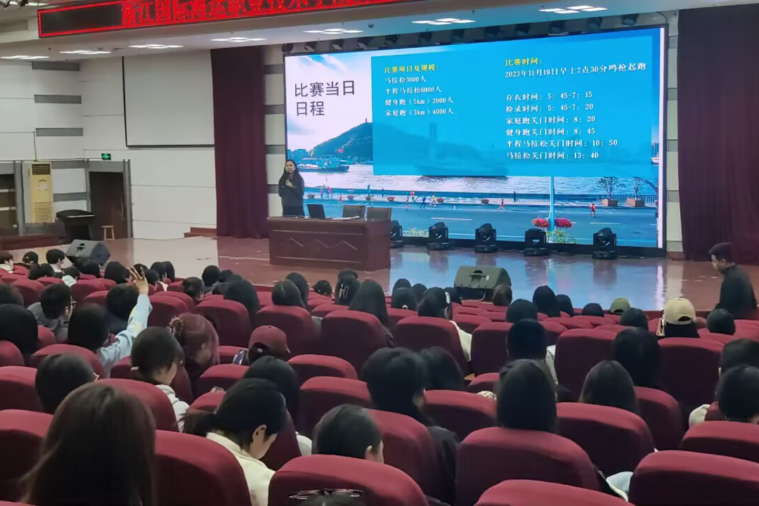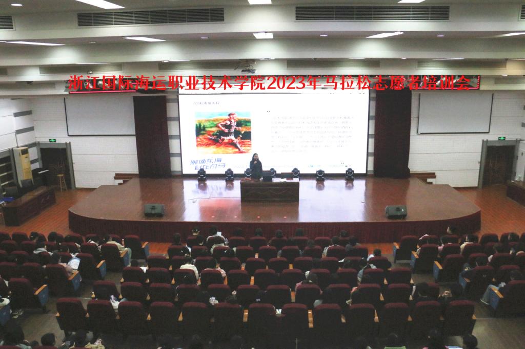 由舟山人民政府主办的2023年舟山群岛国际马拉松即将开赛,为切实做好舟山马拉松赛事志愿服务工作,保障赛事成功举办,11月11日下午,我校招募的358名志愿者在董浩云图书馆进行了志愿者培训。