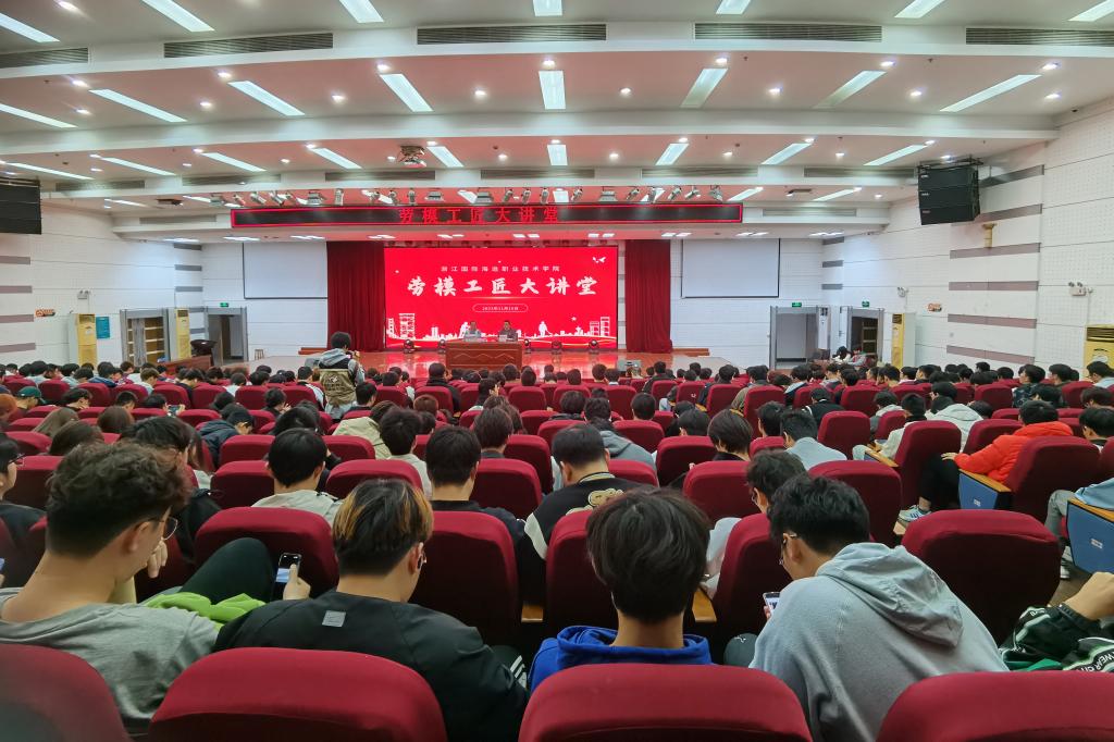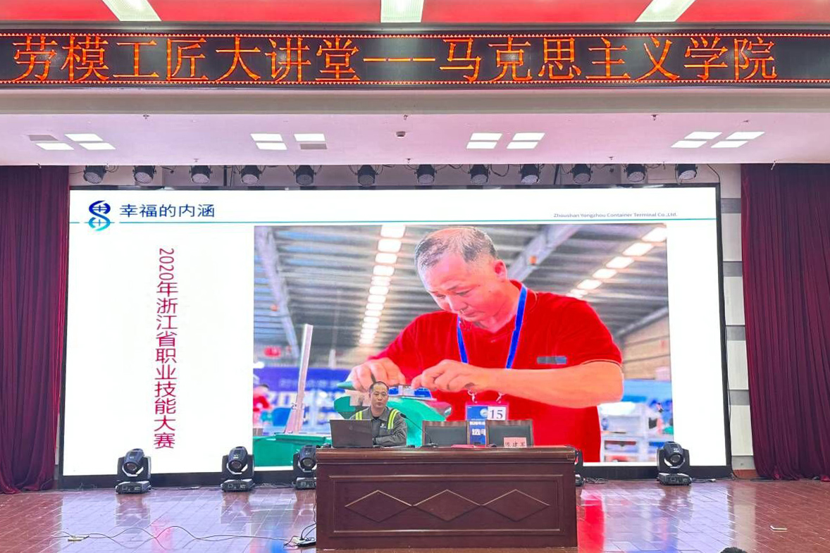 讲座中,陈建军分享了自己在甬舟集装箱公司的成长经历和奋斗历程,给在场的同学们带来了一堂别开生面的劳模工匠思政课,生动诠释了新时代劳模和工匠担当使命,焕发学生们的学习热情、劳动热情,现场不断响起热烈的掌声。