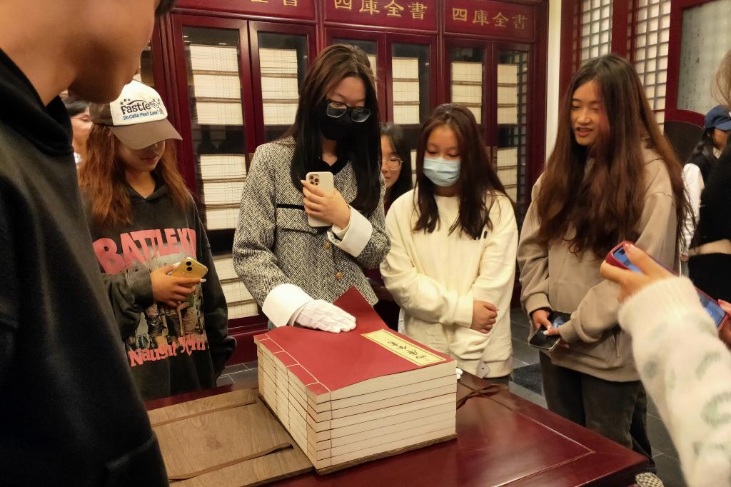 在图书馆,同学们参观了图书馆特藏室、书库、图书馆数据库等,了解了图书馆概况、四库全书的阅览、校园一卡通的使用方法及图书借阅规则。
