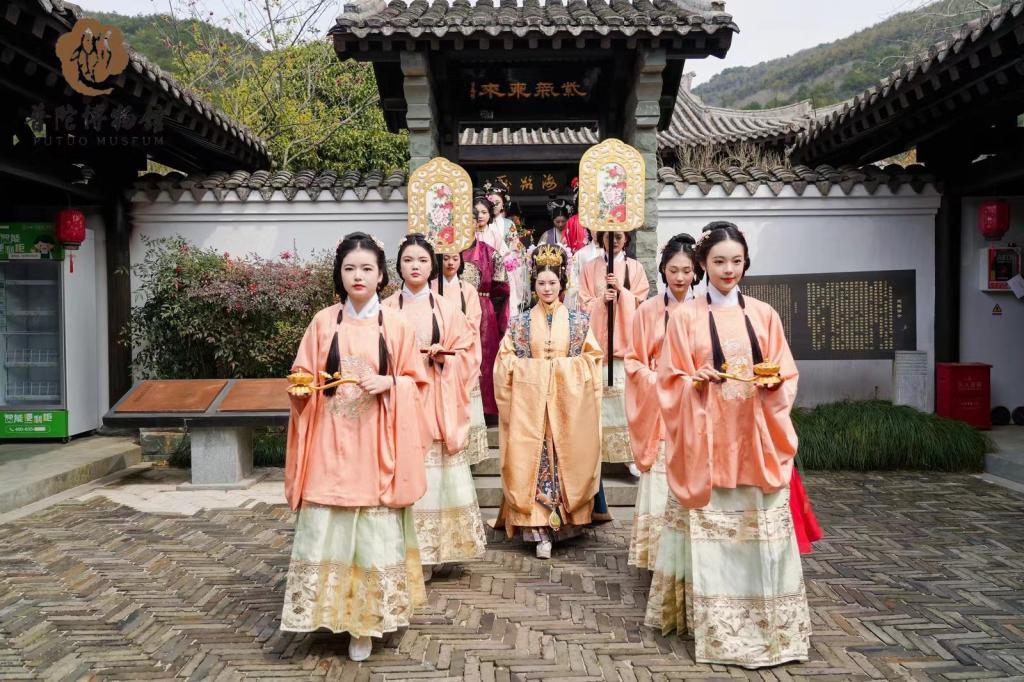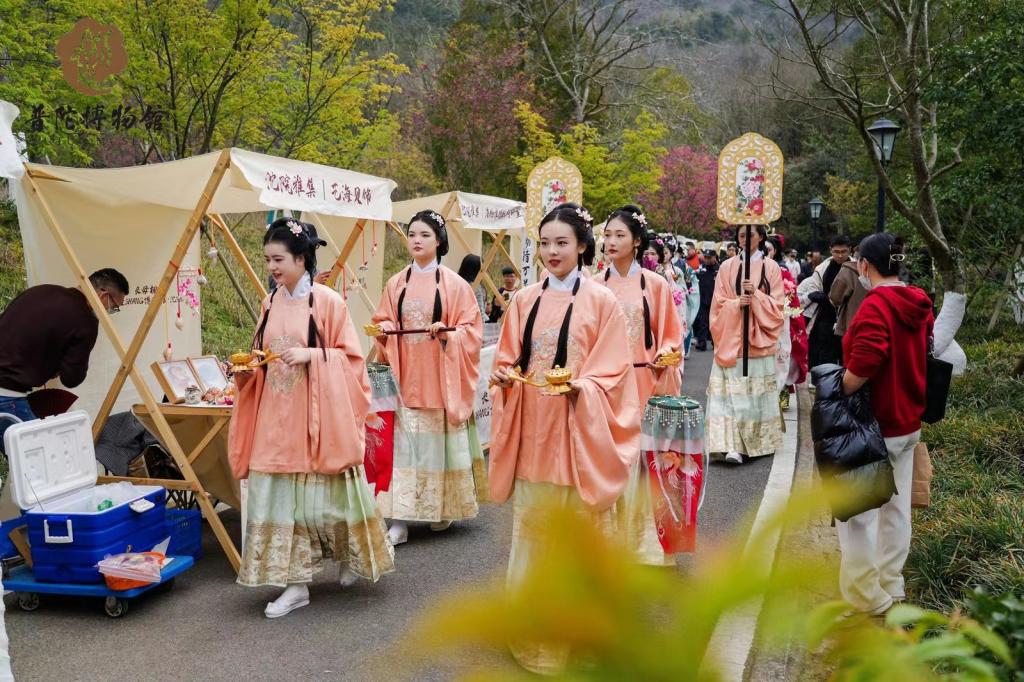 礼仪社的志愿者们身着粉色汉服,手持莲花,祈福献瑞,为十二花神引路,经过沈德精舍、穿过回廊,游园祈福仪式在沈院主舞台拉开帷幕,十二花神风华绝代,代表十二个月令,为游客们带来吉祥和祝福。同时,现场还设有剪纸、花钿彩绘体验、花车打卡拍照等互动环节,游客们在欢声笑语中感受着传统文化的深厚底蕴。