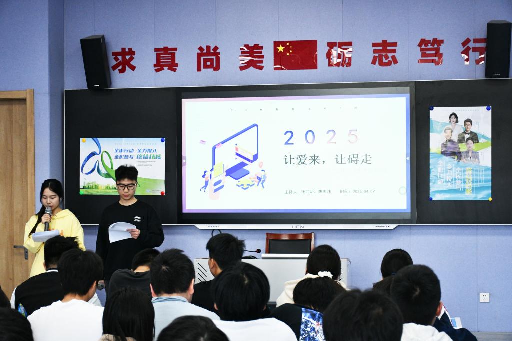4月9日下午,现代港口贸易学院2023级大数据技术1班在图书馆四楼阶梯教室举办了一场主题为“让爱来,让碍走——大学生心理健康护航”的班会公开课。学院党总支书记李刚,副书记邵佩华,全体班主任、辅导员以及各班班长、团支书到场观摩。