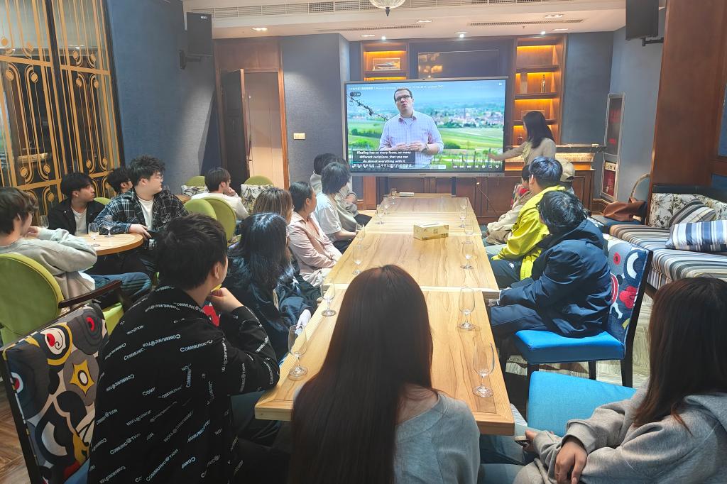 在随后的葡萄酒理论知识讲授环节,孔洁老师介绍了雷司令的特点:以高酸度、丰富香气著称,风格从干型到甜型多样,酒体轻盈优雅,对风土敏感,不同产区风味各异,陈年潜力出色,年轻时果香矿物香浓郁,陈年后发展出独特气息。理论讲解后,社员们共同观看了德国葡萄酒协会制作的纪录片(节选)。影片以4K航拍镜头展现陡峭河岸葡萄园的壮丽景观,并采访当地酿酒师讲述传统技艺,使大家对雷司令的“风土表达”有了更直观的认识。