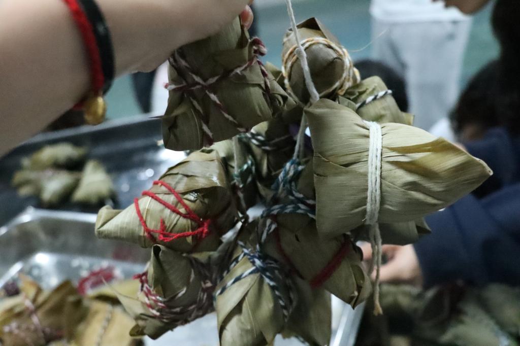 当天下午,活动参与者们齐聚学生食堂,4-6人为一组,他们个个摩拳擦掌,各自挑选了甜、咸糯米,咸蛋黄、鲜肉、红枣、豆沙等馅料,在工作人员的细致教授下,同学们逐渐掌握了包粽子的要领,一个个或小巧或饱满的粽子逐渐成型,再扎上五彩的绳线,心中是满满的成就感。活动结束后,同学捧着蒸熟的粽子,眼里满是欣喜,纷纷表示要带回寝室送给自己的室友尝一尝。