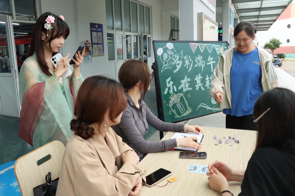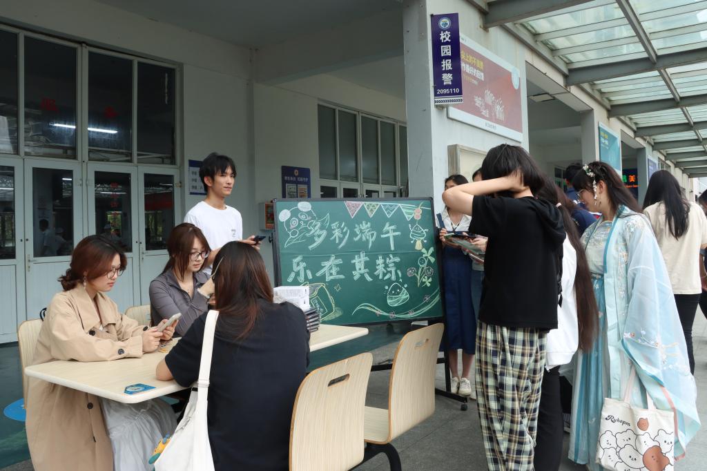 学生食堂外是由校权益部承办的五彩端午端午节知识问答活动。问答题目涵盖了端午节的起源、发展历程、传统习俗等内容。身着汉服的国粹社社员前来助阵,为过往的活动参与者普及端午节地方习俗和节日禁忌。