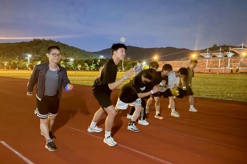 夜幕降临,当晚七点,活动正式开始。随着节奏感十足的音乐声响起,同学们手戴荧光棒,迈开矫健的步伐,沿着田径场奔跑起来。夜色中,荧光棒闪烁生辉,同学们奔跑的身影与闪烁的光芒交织在一起,形成了一条条灵动飘逸的光带,宛如夜空中流动的星河,将原本静谧的跑道装点得如梦如幻。