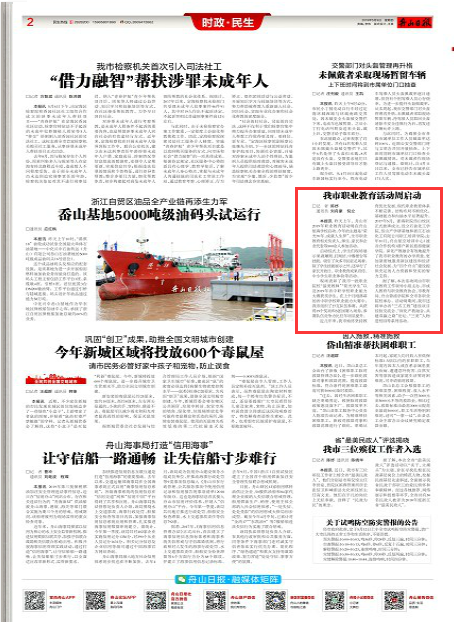 近几年来,我市始终坚持教育优先发展,现代职业教育体系不断完善,结构布局不断忧化,基础能力和内涵水平显著提升。2017年5月,浙海职院岱山校区正式挂牌成立,设立石油化工学院,岱山产学研基地和浙江石油化工有限公司职工培训学院;去年10月,舟山航空培训中心(波音合作机构)落户新区旅游健康学院。深化产教融合有效地提升了我市职业教育的办学质量,更加紧密地服务新区建设和经济社会发展,为“四个舟山”建设提供充足的人力资源和坚实的智力支持。