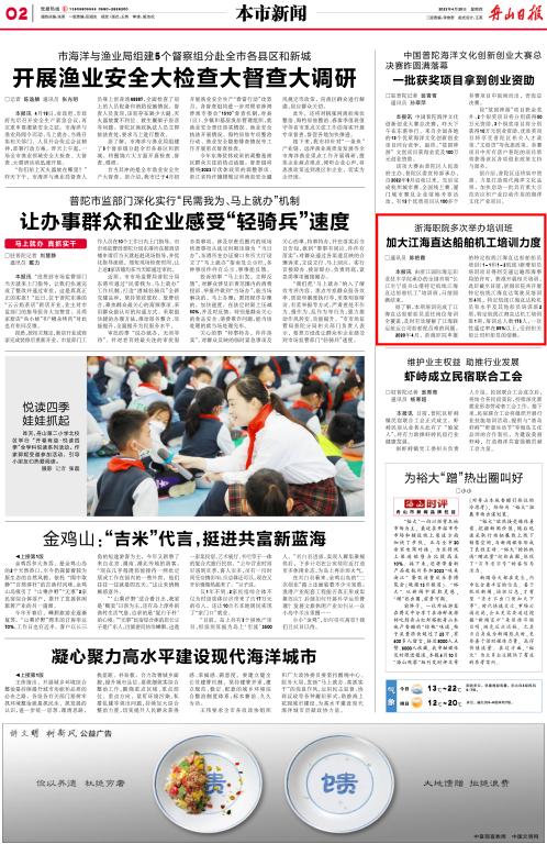 《舟山日报》:浙海职院多次举办培训班 加大江海直达船舶机工培训力度
