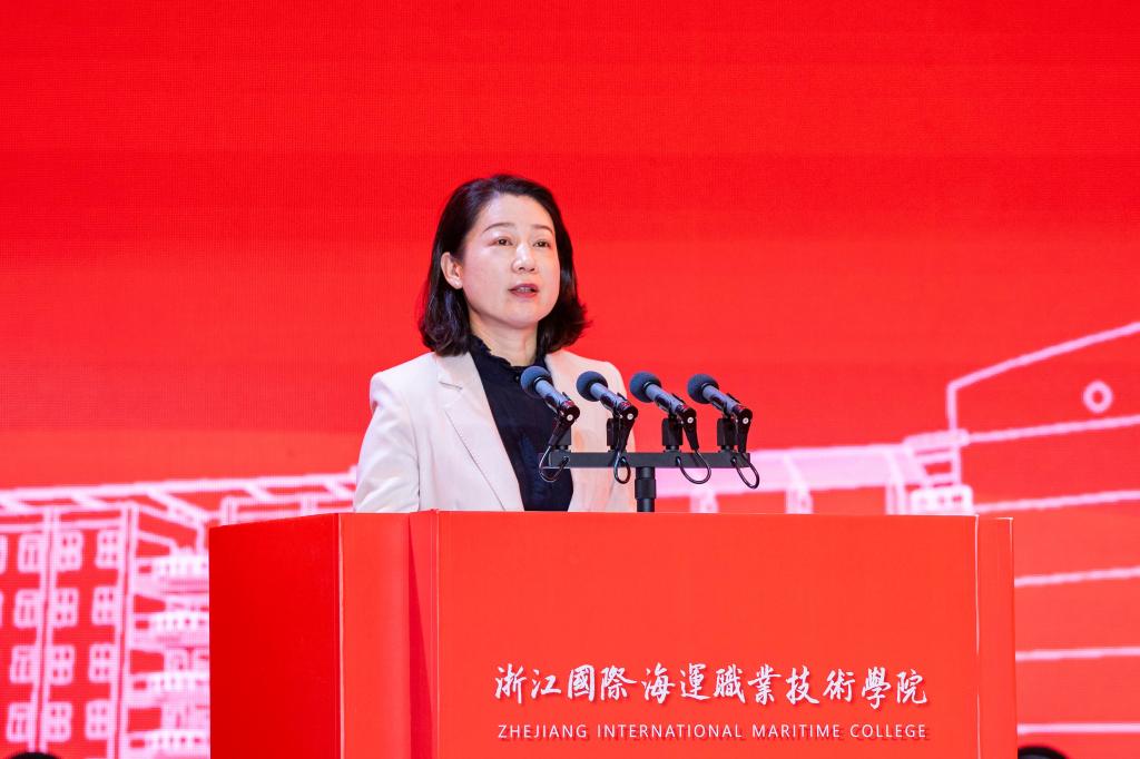 舟山市人民政府副市长洪碧代表市政府充分肯定了学校40年的办学成就。四十年来,学校始终坚守为党育人、为国育才的初心使命,励精图治、砥砺前行,取得了一系列扎实而丰硕的办学成果。学校坚持立德树人,深化育人模式改革,面向地方需求开展百千服务行动,为我市培养输送了大量高素质技能人才,大批校友在港航、渔业、旅游和石化等行业领域发光发热、贡献力量;学校坚持服务地方,主动聚焦地方发展战略,专业布局全面对接海洋产业,自觉当好舟山经济社会发展的参与者、实践者和推动者;学校坚持办出特色,不断提升治校能力和水平,在省对高职院校的年度综合考核中不断争先进位。她表示市委市政府将一如既往、加大力度支持学校的高质量发展,为学校办学创造更好条件,推动学校实现更高水平的提升。同时提出最诚挚的三个希望:希望学校以办学40周年为新起点,深入学习贯彻全国教育大会精神,持续保持铸魂育人的本色,大力培养大国工匠、能工巧匠、高技能人才;希望学校持续强化海洋职教的特色,放大海运办学的优势,建设高水平专业群,建成海洋特色鲜明的高水平职业院校;希望学校继续紧贴地方发展需求,紧贴产业、紧联企业,构建更为完善的产教融合协同育人体系,吸引更多在舟学子乐学舟山、扎根舟山、服务舟山。