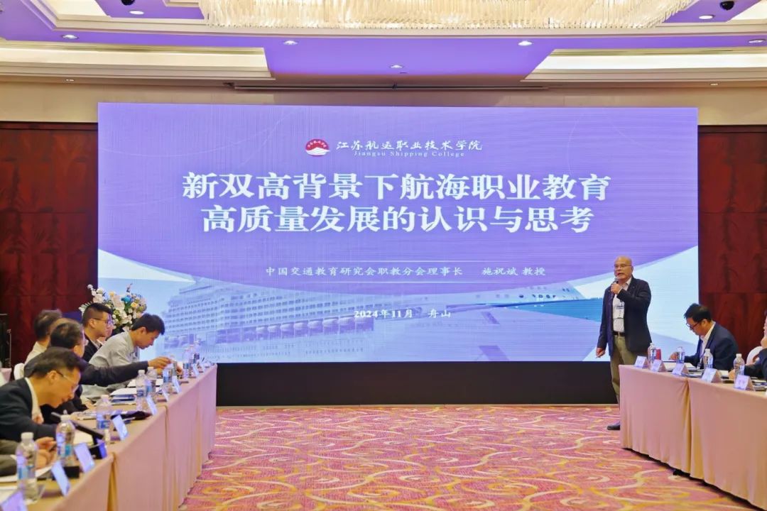 会议邀请了中国交通教育研究会职业教育分会会长施祝斌教授,金山轮船国际有限公司船舶管理部助理总经理、资深甲类船长谭拥军分别围绕航海职业教育高质量发展、高素养船员培养、航海教育合作等作主旨报告。