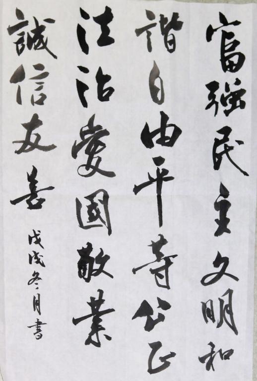 为响应舟山创建全国文明城市的号召,11月15日晚,国际教育学院在1412教室组织开展了“感悟社会主义核心价值观”书法比赛活动。