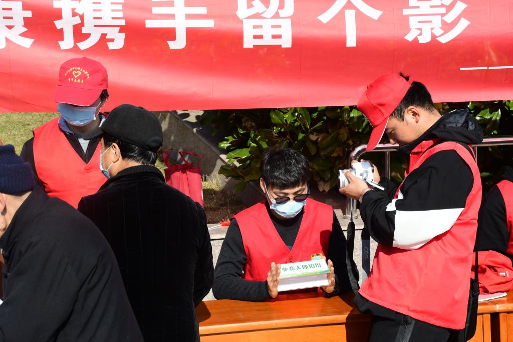 社团招募了学院的摄影爱好者,并借助摄影工作室的设备技术优势,为社区50岁及以上居民免费拍摄照片,以志愿服务传递爱心。路过的居民们纷纷结伴前来参与活动,在绿色背景前,有银发苍苍的老两口并肩而立、有志同道合的老年团开怀大笑、也有芳华依旧的个人独照幸福感满满……随着快门“咔擦”声响起,每一个画面都被定格,每一帧笑容都被记录。
