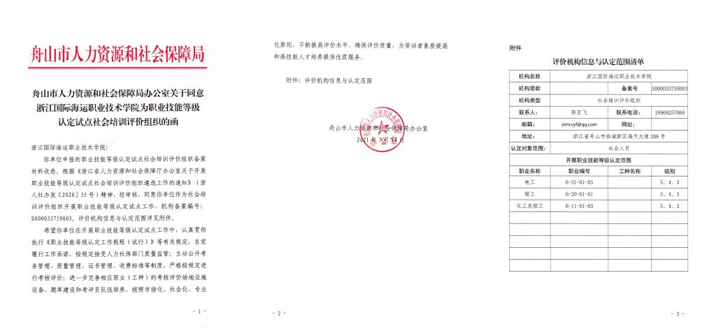 我校于2020年12月向舟山市人力资源和社会保障局提交了“职业技能等级认定试点社会培训评价组织”申请材料,于今年3月17日接受主管部门开展的现场核验,最终于7月中旬获得批复同意。