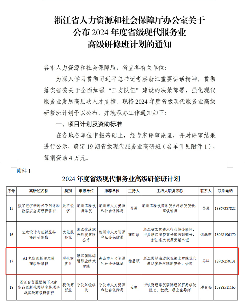 近日,浙江省人力资源和社会保障厅公布了《关于公布2024年度省级现代服务业高级研修班计划的通知》,共有19项省级现代服务业高级研修项目获得省级财政资助。我校现代港口贸易学院申报的“AI电商创新与应用高级研修班”成功入选。