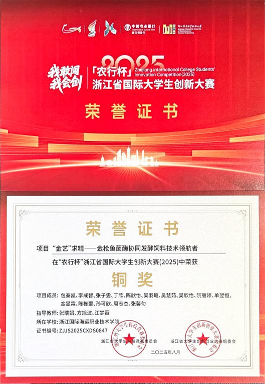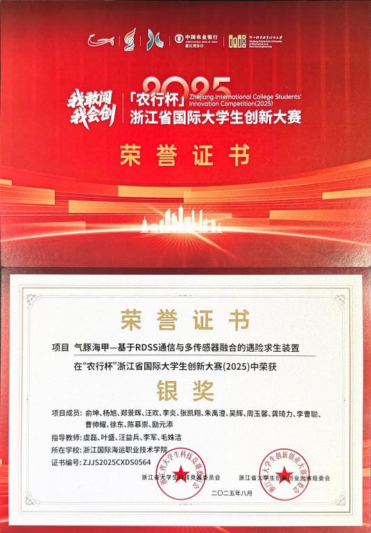 其中,由俞坤、李炎等同学组队,在虞磊、叶盛、汪益兵等老师的指导下,凭借《气豚海甲—基于RDSS通信与多传感器融合的遇险求生装置》项目荣获银奖;包秦凯、李成智等同学组成的团队,在张瑞娟、方旭波、江梦薇老师的指导下,凭借《“金艺” 求精——金枪鱼菌酶协同发酵饲料技术领航者》项目夺得铜奖。